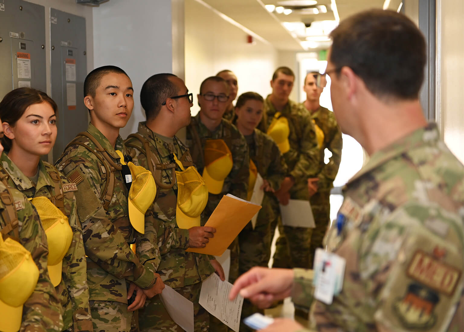 Basic Cadets in-process at the U.S. Air Force Academy’s Cadet Dental Clinic, July 10, 2023. During dental in-processing, each basic cadet receives an evaluation from a dentist and then, upon completion, receives a classification from class one to three, which denotes their military readiness. (U.S. Air Force photo by Tech. Sgt. Zach Vaughn)
