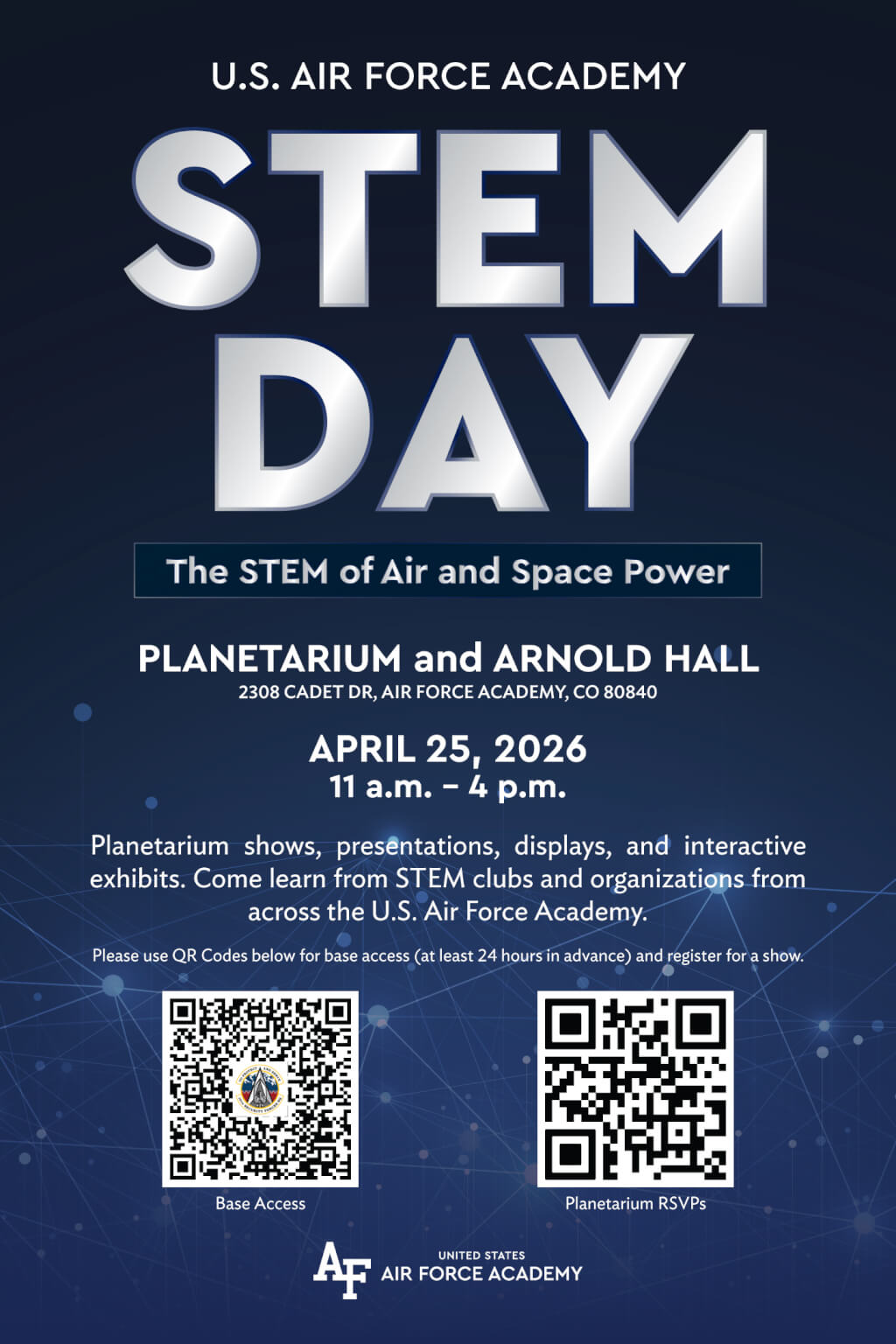 | Saturday, April 25 | ![]() USAFA STEM DAY – Open to ALL 10:00 a.m. – Flight Adventures – RSVP here 10:30 a.m. – Worlds Beyond Earth – RSVP here 11:00 a.m. – Live Night Sky Tour – RSVP here 11:30 a.m. – Astronaut – RSVP here Noon – Live Solar System Tour – RSVP here 12:30 p.m. – Dark Universe – RSVP here 1:00 p.m. – Apollo 11: First Steps – RSVP here 2:00 – p.m. – Fighter Pilot – RSVP here |