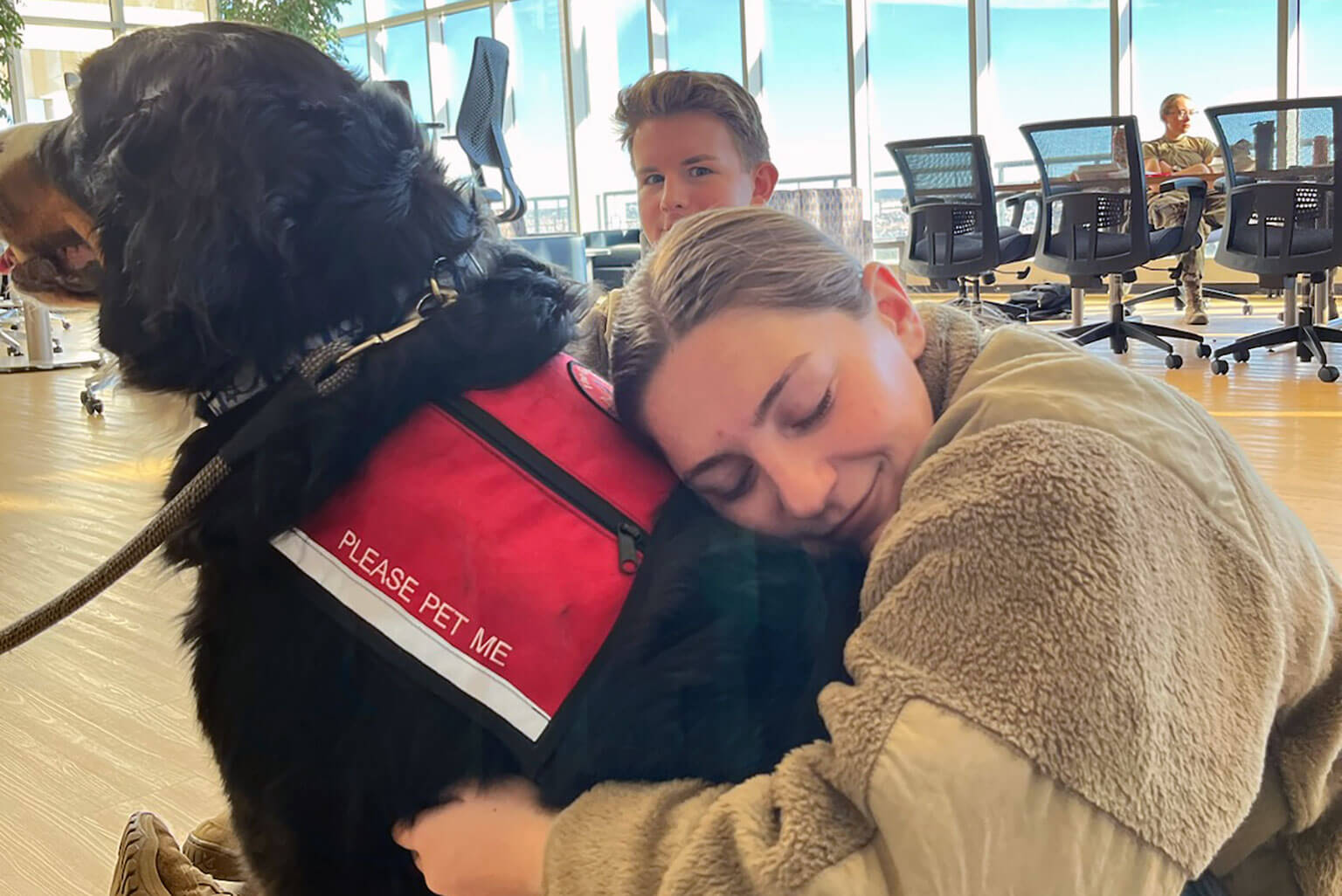 U.S. Air Force Academy Cadet 4th Class Eri McClain-Yu holds Go Team Therapy Crisis and Airport Dog Spiff in McDermott LibraryU.S. Air Force Academy Cadet 4th Class Eri McClain-Yu holds Go Team Therapy Crisis and Airport Dog Spiff in McDermott Library Dec. 11, 2023. (U.S. Air Force photo by Rayna Grace)